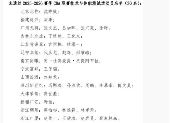 新疆男篮、北控男篮、福建男篮、宁波男篮、山西男篮、天津男篮各1人未通过