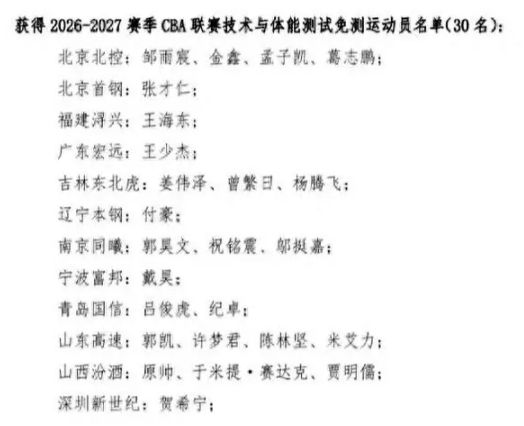 与未通过体测的规则相似,下赛季免测球员则是体测成绩排在前10%的。