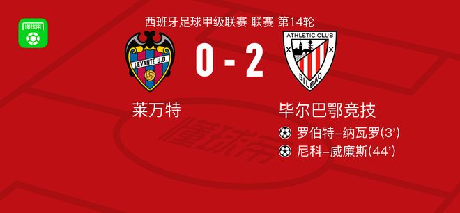 毕尔巴鄂竞技2-0莱万特,罗伯特-纳瓦罗破门,尼科-威廉斯锁定胜局